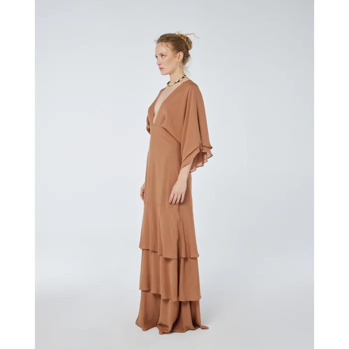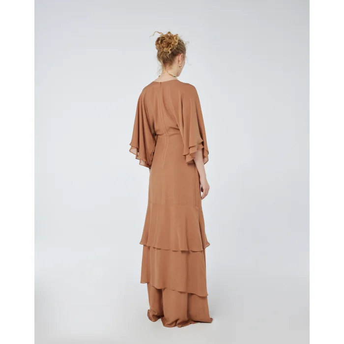 A sophisticated yet effortless gown, blending structured femininity with soft, flowing layers for a refined statement look.