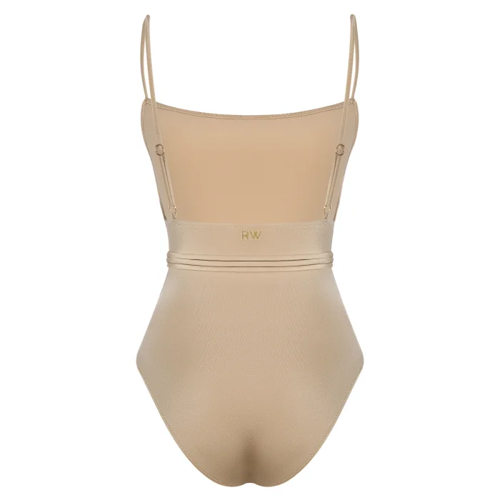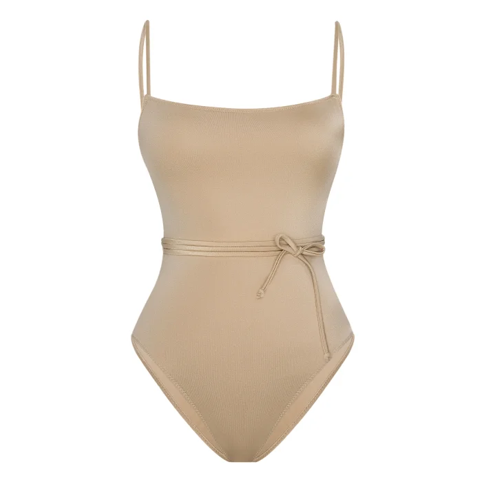 Square neck, thin straps, low-cut back swimsuit.