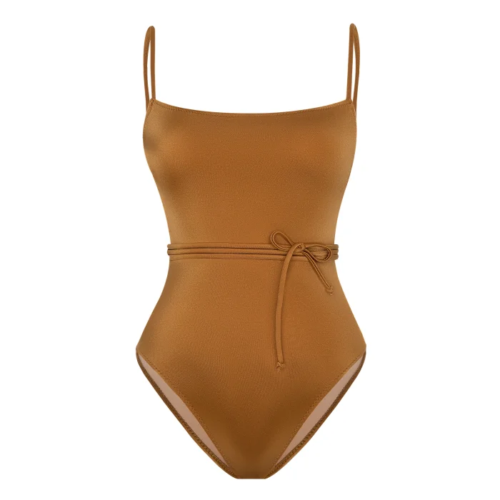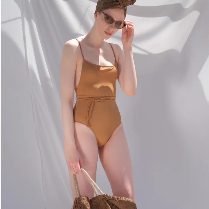 Square neck, thin straps, low-cut back swimsuit.