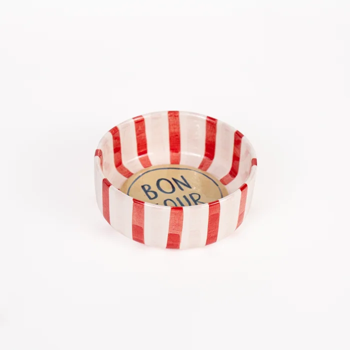 Add a little smile and Mediterranean breeze to your table. Offering a classic elegance with its vibrant red vertical lines on a white background, this bowl offers a story that will accompany you with every use with its handwritten "BON TOUR" detail on the base.
