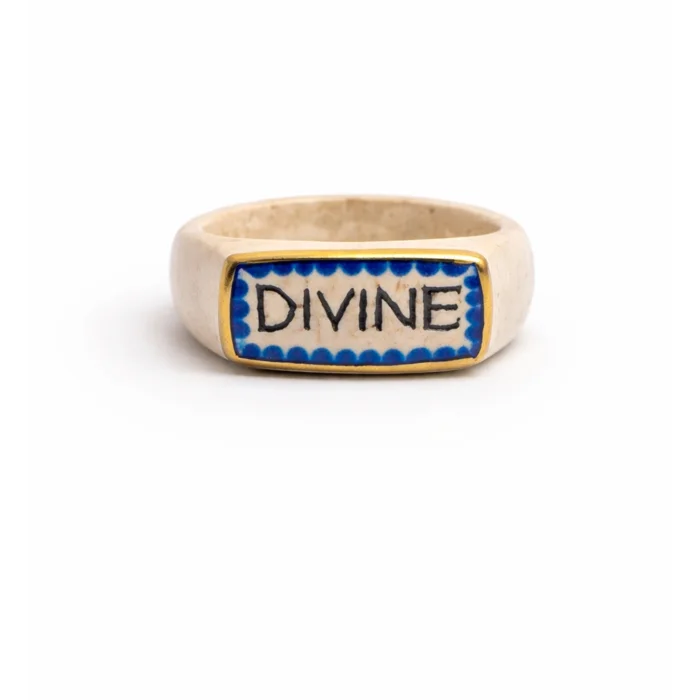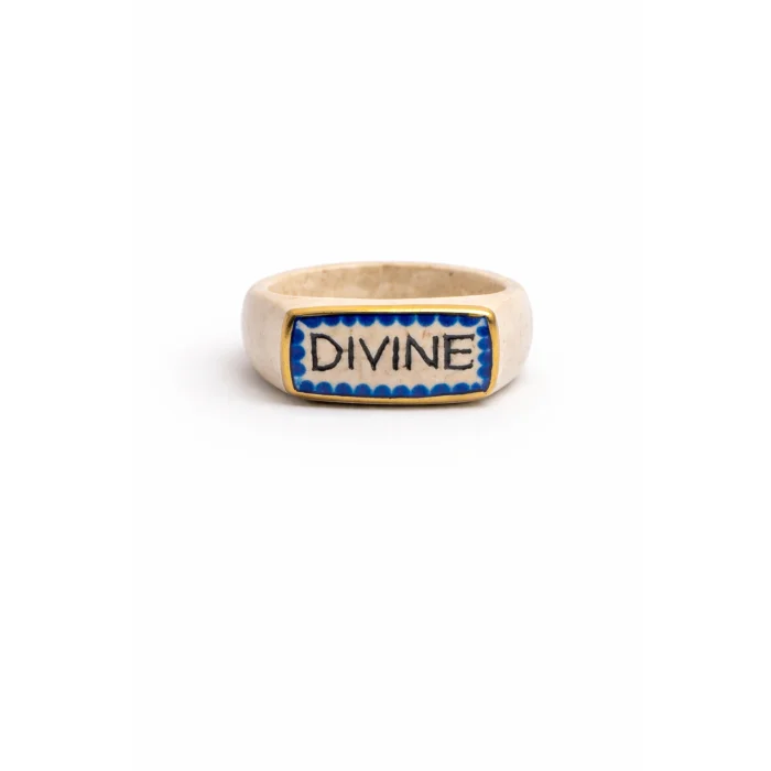 Handcrafted ceramic ring featuring a “DIVINE” plaque design framed with gold detail.