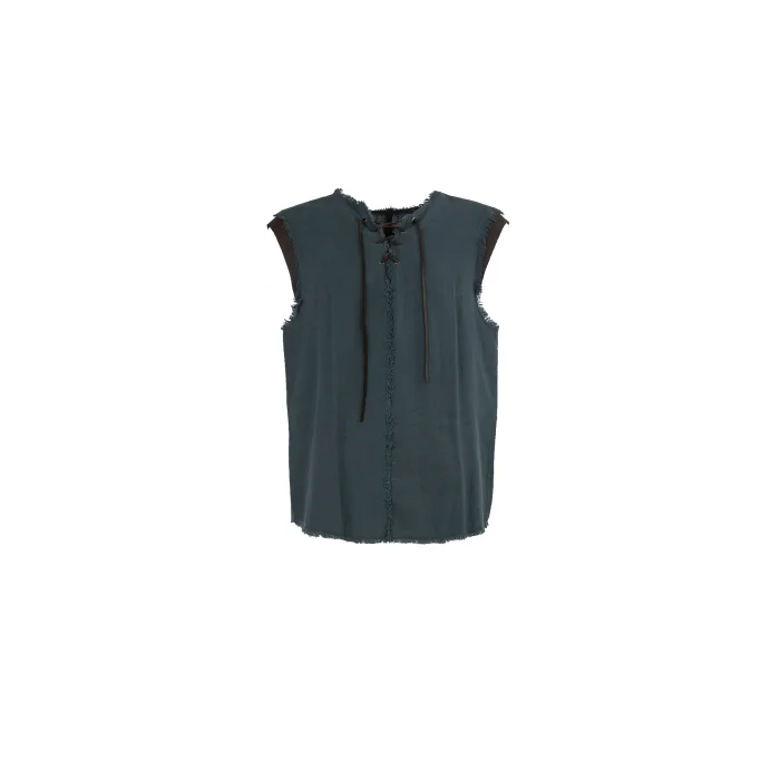 Handwoven cotton combines with masculine, leather shoulder coverings and a cross-linked collar. Tassels on the edges and front center seam reveal the primordial essence of the wearer. Perfect for extreme occasions, this vest can also be worn in casual times. Over time, the specially painted and handcrafted characters transform these pieces, with the colors fading and the leather becoming aged, adding to its uniqueness.