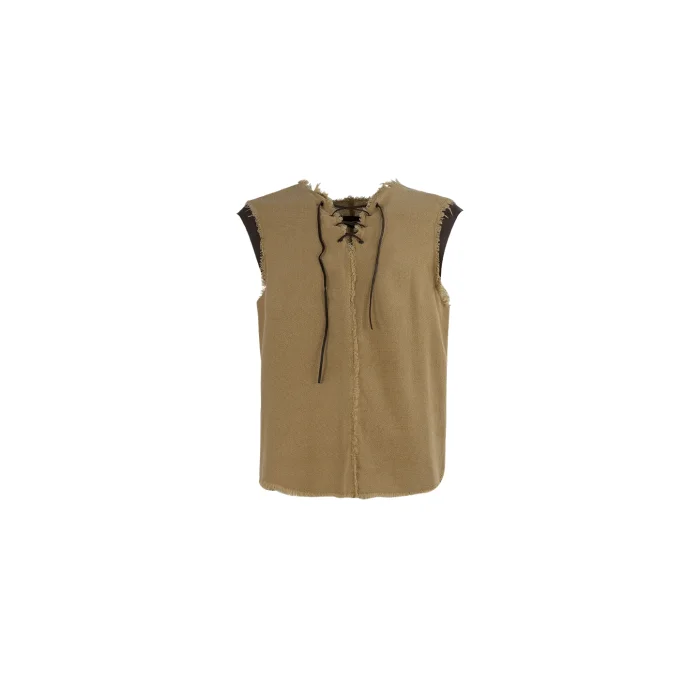 Handwoven cotton combines with masculine, leather shoulder coverings and a cross-linked collar. Tassels on the edges and front center seam reveal the primordial essence of the wearer. Perfect for extreme occasions, this vest can also be worn in casual times. Over time, the specially painted and handcrafted characters transform these pieces, with the colors fading and the leather becoming aged, adding to its uniqueness.