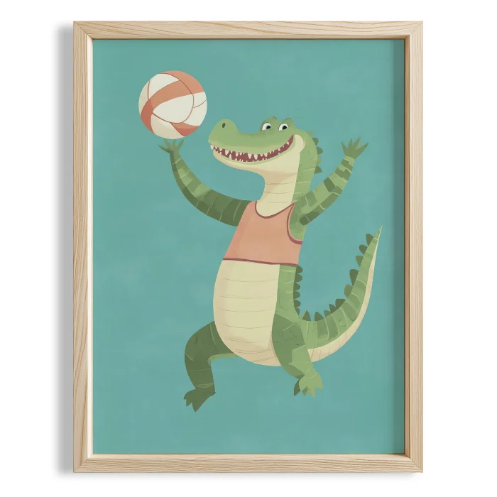 Product: Volleyball Player Crocodile - Blue Background Children's Room Wooden Framed Wall Art