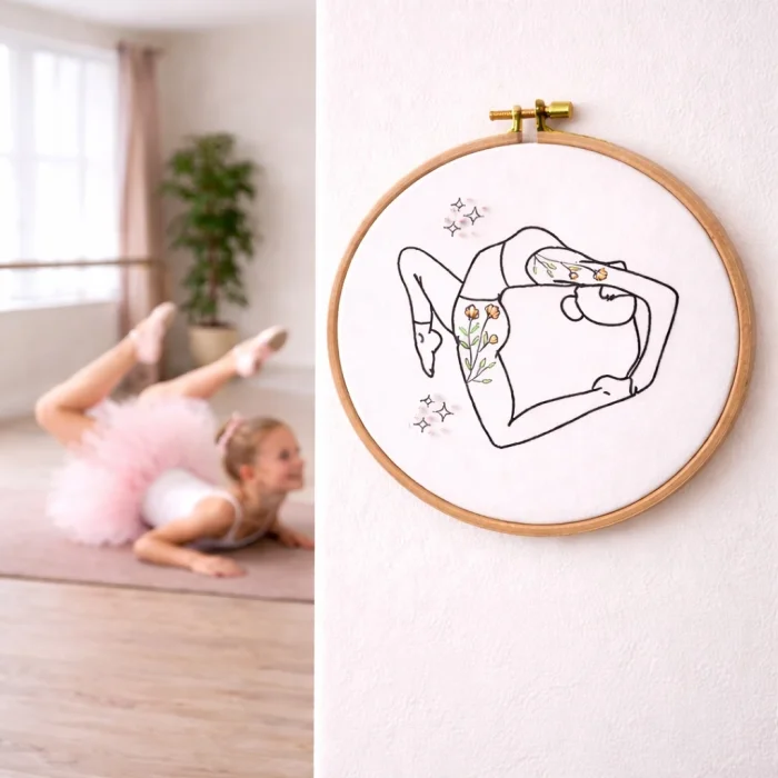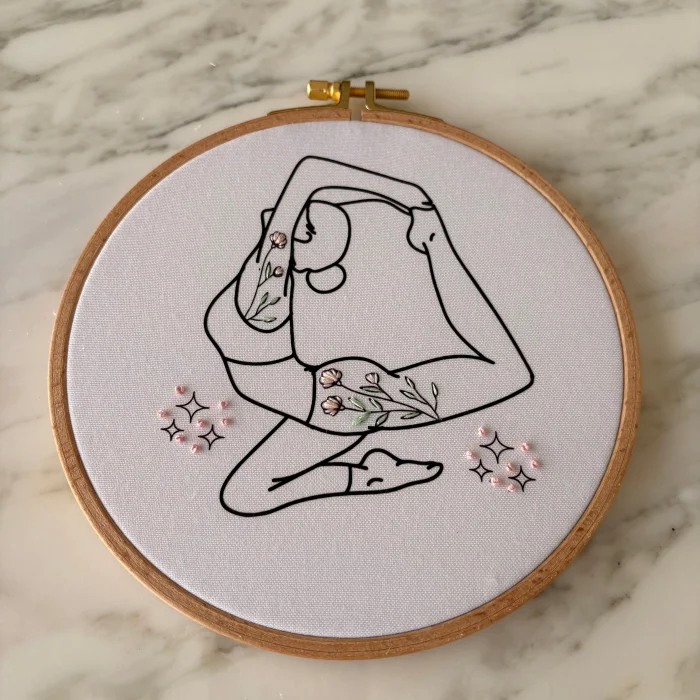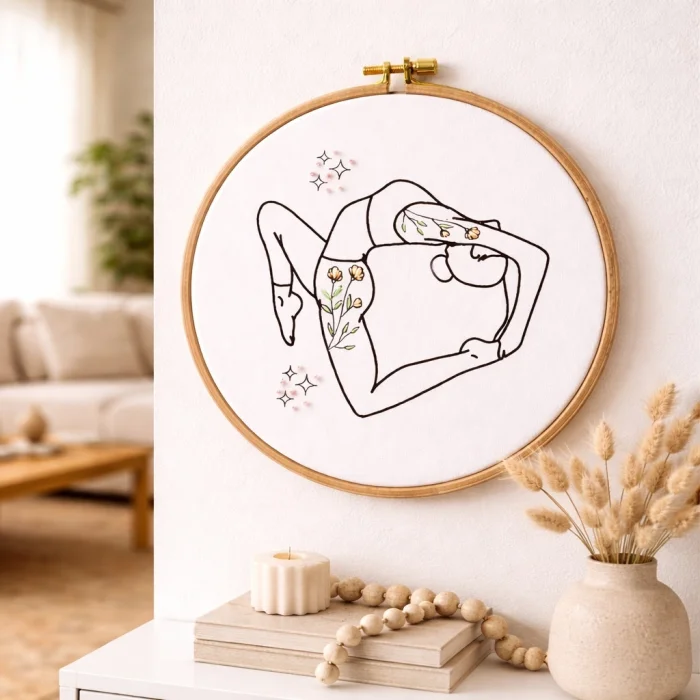 The female figure created with minimal lines reflects one of the most aesthetic stances in the world of plates and yoga, while the elegant flower details embroidered on it remind us of our harmony with nature.