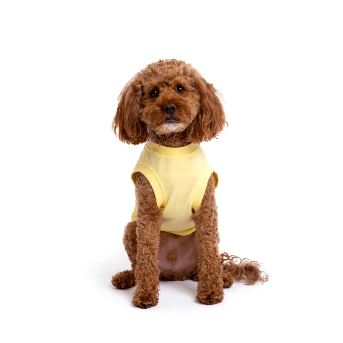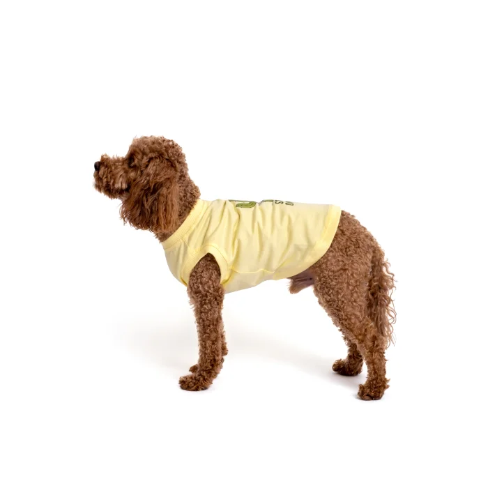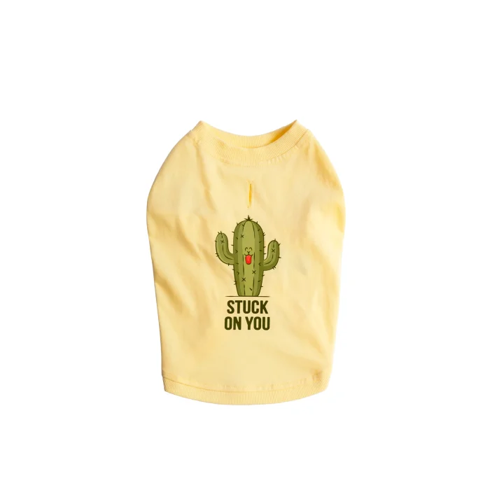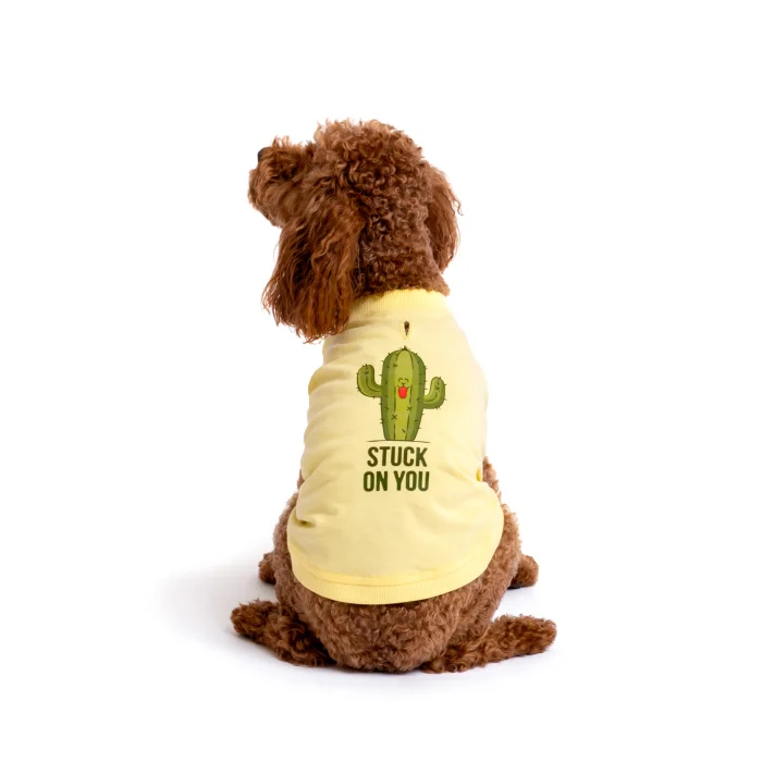 design ⦁ The "Stuck On You" dog t-shirt is inspired by the energy of the summer months and loyal friendships. Its light yellow color reflecting the sun offers a fresh and positive appearance in hot weather; Its lightweight cotton texture allows your dog to move freely throughout the day. While the humorous cactus illustration in the center of the design, with its arms outstretched, represents a tough but cute character from the outside; The humorous slogan "Stuck On You" reflects loyal souls who love to live glued to their owner. Produced with high-quality DTF printing technique, this piece is a candidate to be a favorite of summer combinations, whether alone or with a matching bandana. Functionality ⦁ Leash Access Hole: Ideal for safe and comfortable walks. ⦁ Light Colored Fabric: It offers coolness in hot weather thanks to its light yellow tone that reflects sunlight. Material ⦁ 100% cotton, premium Compact Combed Single Jersey fabric. ⦁ DTF Printing: High-quality, long-lasting direct transfer technology. Model Size Measurements ⦁ Featured Model: Papel, Miniature Poodle. ⦁ Back Length: 33 cm. ⦁ Chest Circumference: 41 cm. ⦁ Neck Circumference: 27 cm. ⦁ Weight: 6 kg. ⦁ Size Worn by the Model: L.
