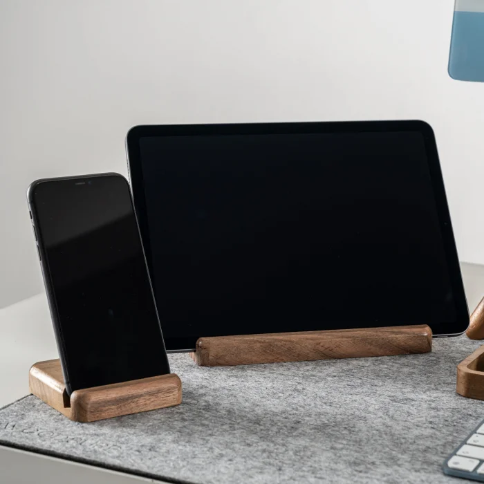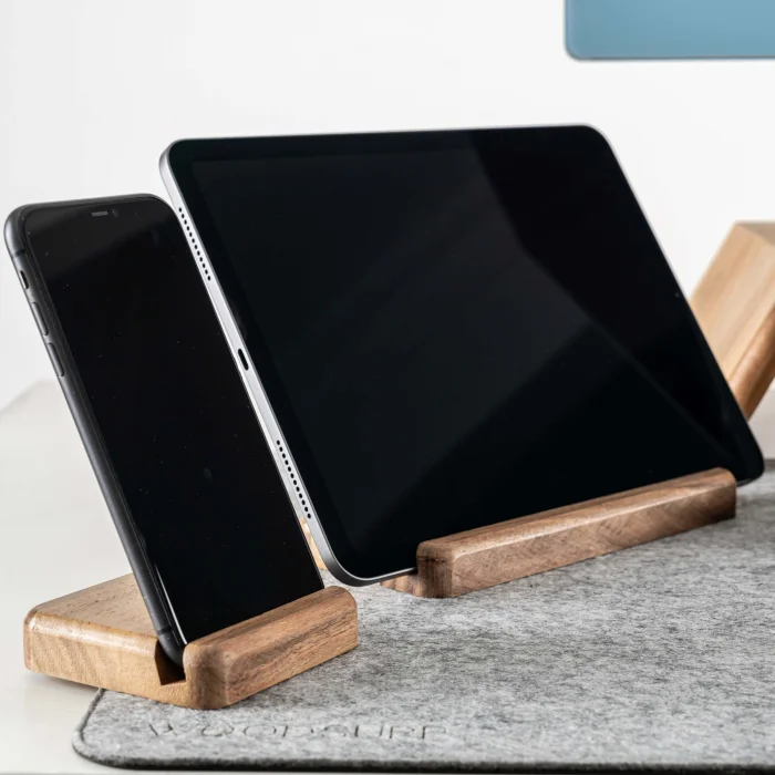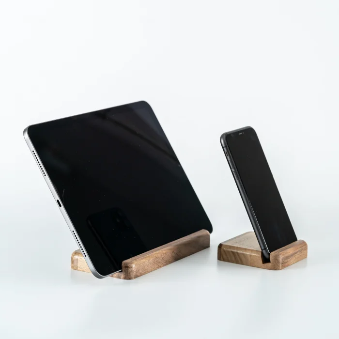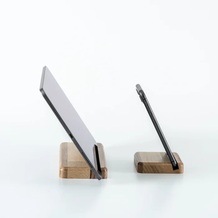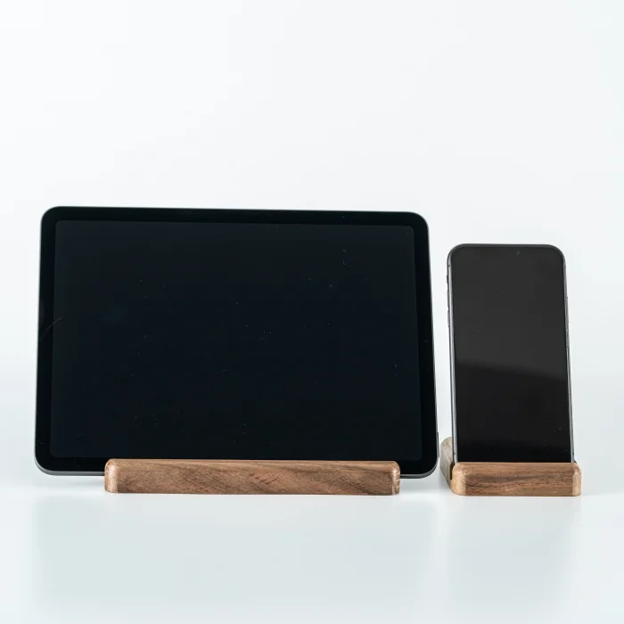 Space for Phone and Tablet:1.1cm • Tablet Holder Product Dimensions: 18x8x1.8cm • Length: 18cm • Width: 8cm • Height: 1.8cm • Phone Holder Product Dimensions: 8x8x1.8cm • Length: 8cm • Width: 8cm • Height: 1.8cm It offers a wide base that is compatible with different tablet models. It offers a safe and stylish support when using or charging your phone and tablet. The stand, which can hold your phone vertically or horizontally, provides practicality when watching videos, making video calls, or organizing your desktop. Enjoy using your tablet while watching videos, reading books, or working. All of our products are produced in our wood workshops in Izmir. Since it is produced entirely from natural wood, there may be color and pattern differences between the products. The product is made of pine wood, water-based varnish is used, which is harmless to health. You can use it for a long time with peace of mind. The varnish made to protect the products is handcrafted by our certified teachers in the art workshop.