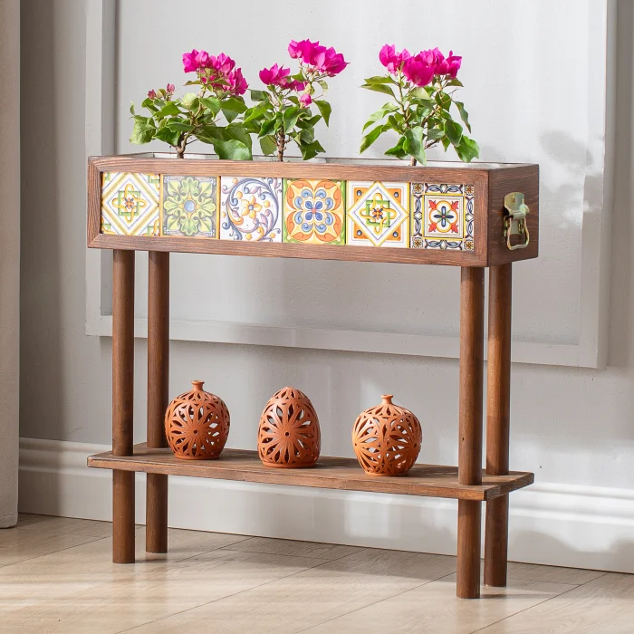 A unique piece for your garden or home garden, the "Wooden Pot and Plant Stand" is a blend of the naturalness of pine wood and the vitality of Mexican Tiles. 6 pieces of Talavera Tiles are surrounded by a wooden frame and placed in a flower pot. Each of the eye-catching tiles measures 10x10 cm and is presented on the front side of the wooden flower bed. There are 4 lathe feet attached to the bottom of the pot with metal plates. This allows the Flower Bed to stand stable and strong on the ground. Between the legs there is a wooden bottom shelf where you can store your garden tools, home accessories or flowers in their separate pots. The top plant holder has internal insulation so you don't need to use an additional primer to grow your flowers. We use a non-toxic, high-quality insulating material that protects the inner surface from moisture. The outer surface of the entire system is covered with wood veneer, which protects the pine wood from the elements and at the same time keeps the rustic texture as natural as it is. The bottom storage rack and legs come disassembled and can be easily assembled by hand in seconds without the need for any equipment. We use the flowers in the photos as a complement to the image. Long-lasting100 % natural Wood Dimensions of the Pot Stand with Shelf: Top Plant Box: Width 61.8 x Depth 15.5 x Height 13.5 cm Total Height (From Floor to Top of Pot): 60 cm