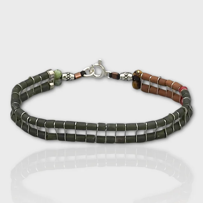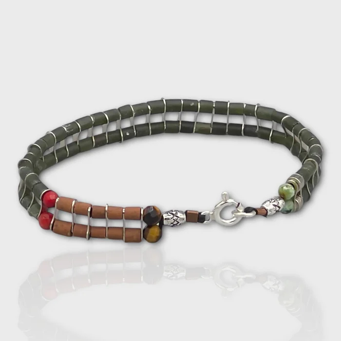 The double row was designed using Jade, coral, tigers eye and silver.