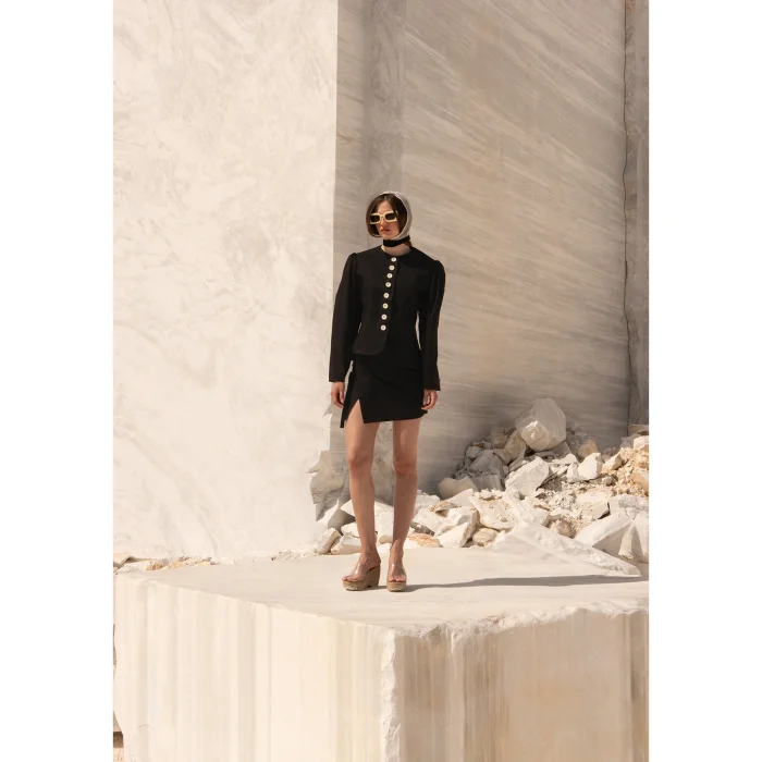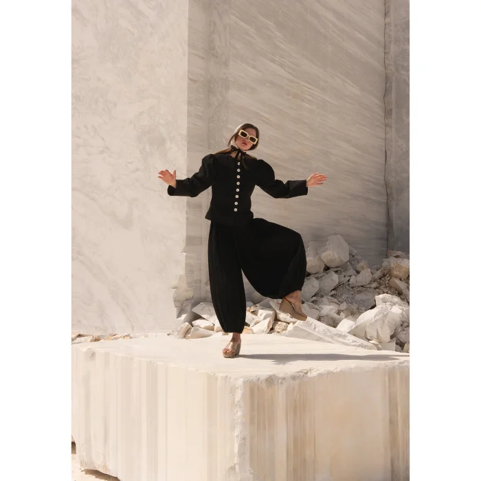 • Black Buttoned Front Padded Drawstring Jacket; It offers a nostalgic yet strong silhouette with its padded shoulders and gathered sleeves.