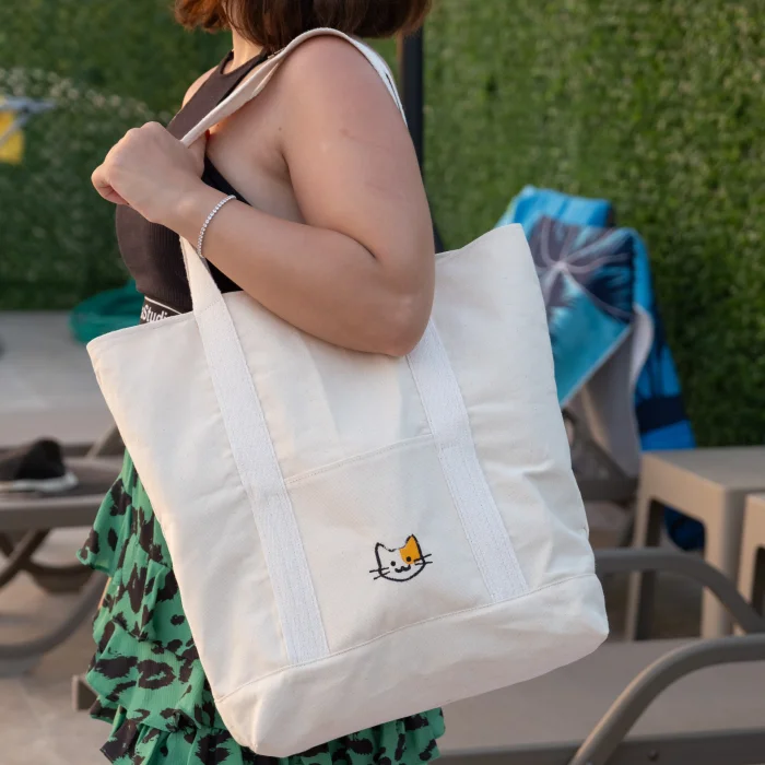 Minimalist cat logo: Sturdy, colorful embroidered detail on the front