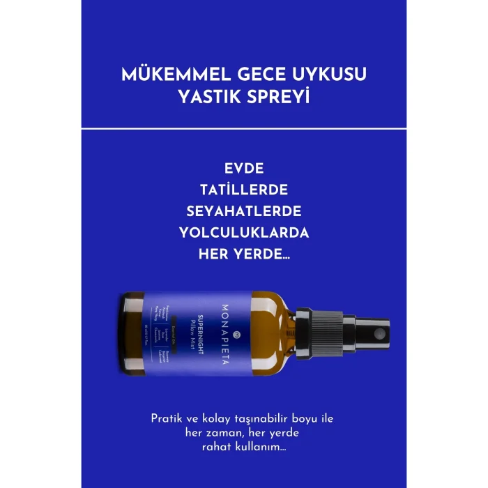 Perfect Night Sleep with Monapixela Superlight Pillow Spray =& Happy and Vigorous Mornings With a Perfect Combination of Specially Selected Organic Frankincense, Patchouli, Vetiver, Ylang Ylang, Lavender, Rose, Jasmine, Chamomile, Rosemary, Bergamot and Cedar & 11 Precious Essential Oils; - Easy transition to sleep,& - Uninterrupted sleep that lasts all night long, - It helps to have a quality, deep and restful sleep experience. It supports relaxation and relaxation with its pleasant and light scent coming from the organic essential oils in its content. It is enriched with organic aloe vera, which is both friendly to your skin and friendly to your pillow. Does Not Contain Perfume and Alcohol. It is housed in a healthy glass bottle. 50 ml Set Contents Monapieta Perfect Night's Sleep Pillow Spray | 11 Precious Essential Oils | 50 ml x 2 pieces Uses Pillows Sheets Pajamas Laundry Rooms & Environments Usage Areas At home Holidays On travels On Journeys Everywhere... With its practical and easily portable size, it can be used comfortably anytime, anywhere... Clean Ingredients What's Inside? Organic Frankincense Essential Oil Organic Patchouli & Essential Oil Organic Vetiver & Essential Oil Organic Ylang Ylang & Essential Oil Organic Lavender & Essential Oil Organic Rose & Essential Oil Organic Jasmine & Essential Oil Organic Chamomile & Essential Oil Organic Rosemary & Essential Oil Organic Bergamot & Essential Oil Organic Cedar Wood & Essential Oil Organic Aloe Vera What's Not Included? Alcohol Perfume Toxic Chemicals Colorant Paraben Sulfate Phthalates Usage: Before going to bed, squeeze a sufficient amount from a distance of 30 cm onto your pillow and sheets. Warnings: Do not use in the presence of pregnant women, infants and people with respiratory diseases. Do not inhale directly, do not touch the body. It is used externally.