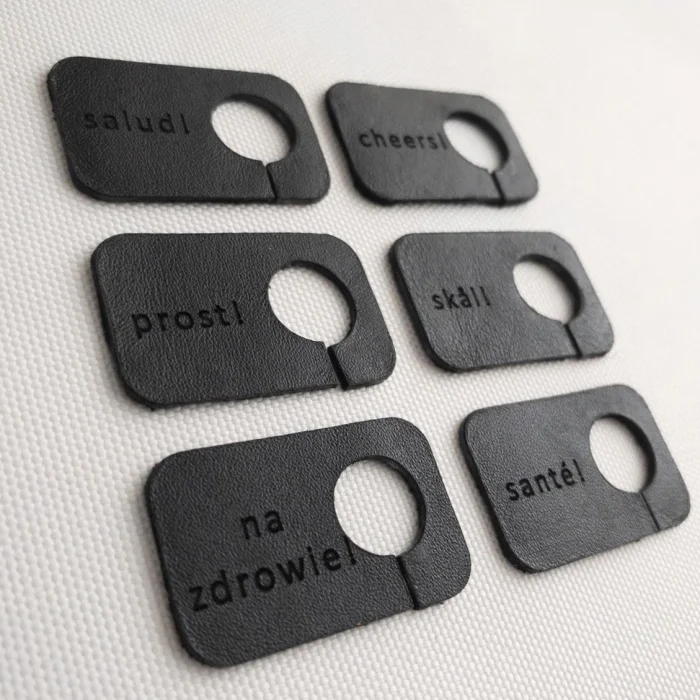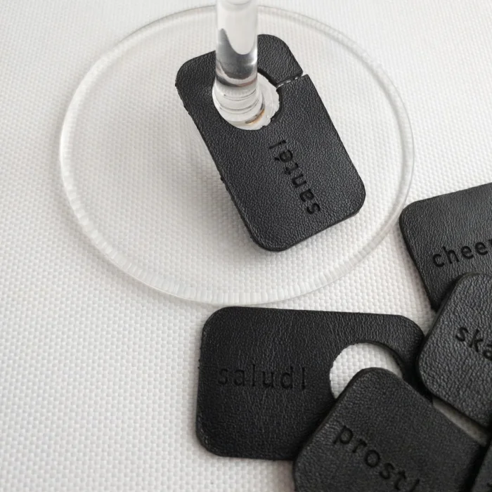 The set includes: 6 leather cup markers, each with the words "cheers" written on them in a different language
