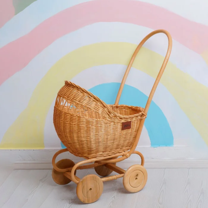 Stroller for carrying dolls for children - hand-woven from natural rattan. It is suitable for children to put their dolls, fruits and toys on the product and play with them in their imaginary play. It can also be put in the children's room for decorative purposes. Since the product is handmade, there may be slight differences between it and the visual