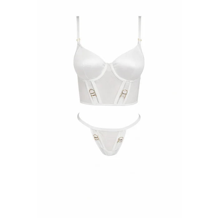 satin bustier with thin straps strikes an elegant balance with the semi-concealer sheer fabric, while the high-cut briefs give the design a bold and feminine stance.
