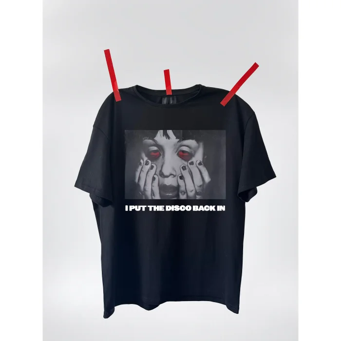 "I PUT THE DISCO BACK IN" printed t-shirt.round neck.made of %100 cotton fabric.oversize.
