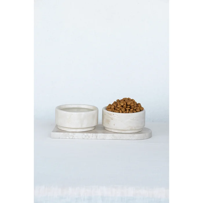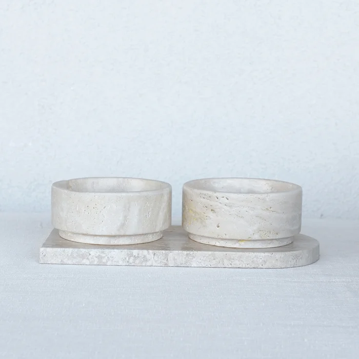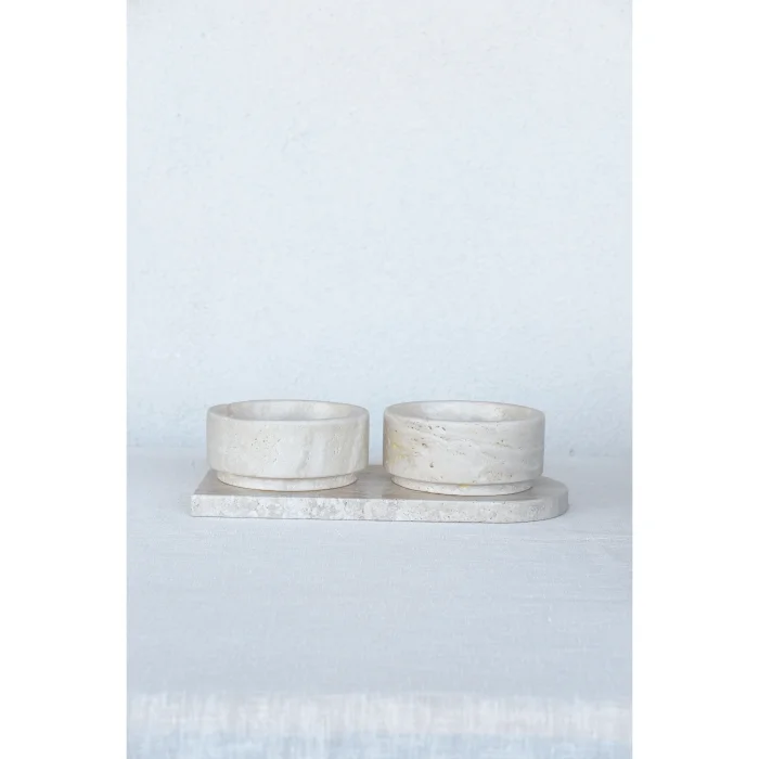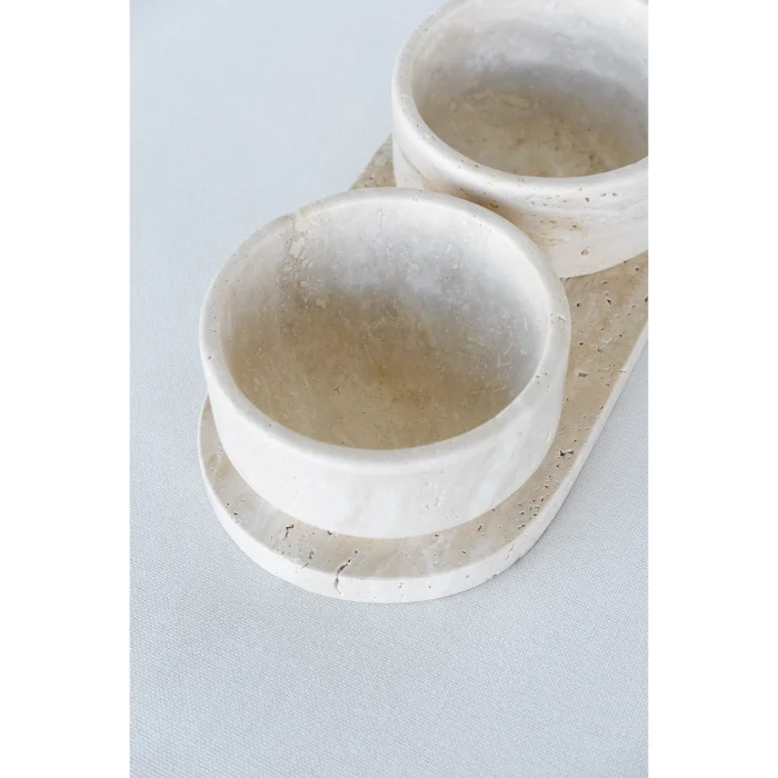Its material is light travertine. Plate Dimensions: 35cm x 17cm x 2cm ; Bowl: 16cm x 16cm x 7cm