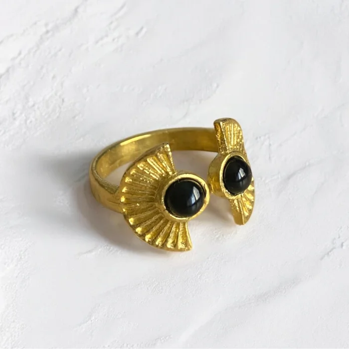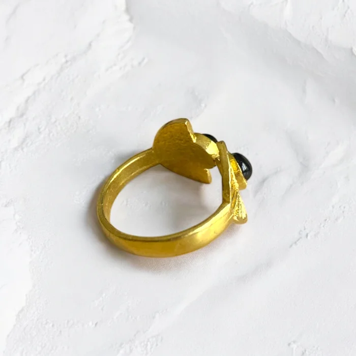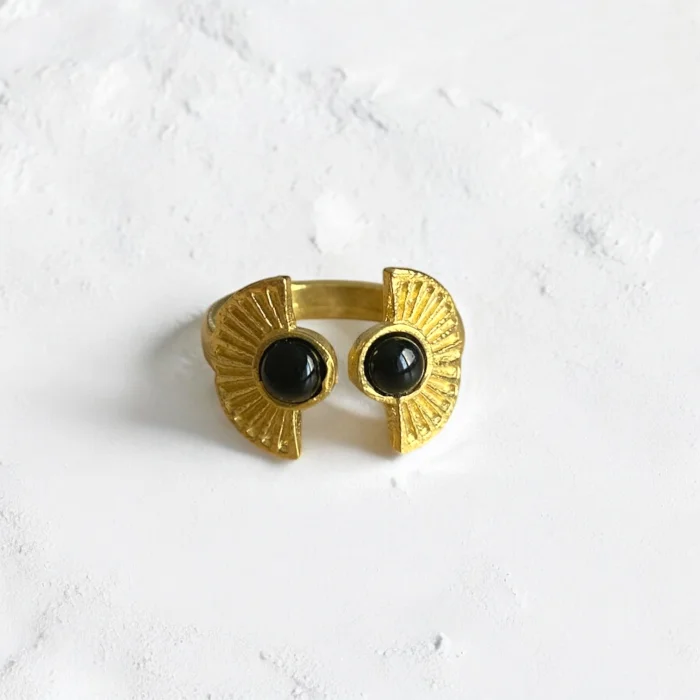 It is made of natural stone and brass. Since it is adjustable, it is compatible with all fingers. Due to the 100% natural materials, there may be slight variations in color and pattern.