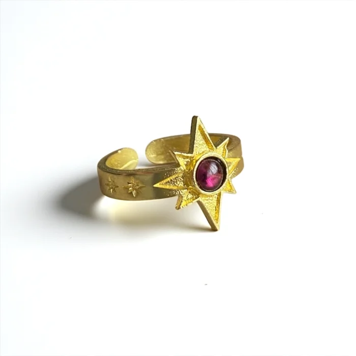 It is made of natural stone and brass. Since it is adjustable, it is compatible with all fingers. Due to the 100% natural materials, there may be slight variations in color and pattern.