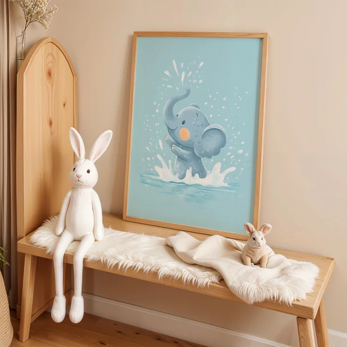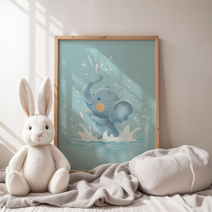 Product: Swimmer Elephant - Blue Background Children's Room Wooden Framed Wall Art