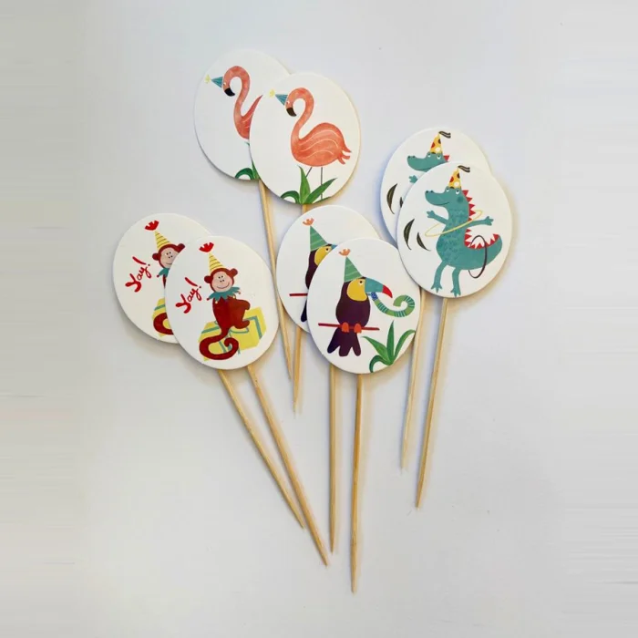 8 in a package cake and food toppers. 4 different designs with crab, sea horse, jelly fish and sea turtle design. Elliptical paper cartoon on a bamboo stick, w: 5 cm, h: 6 cm. Height with bamboo stick: 15 cm.