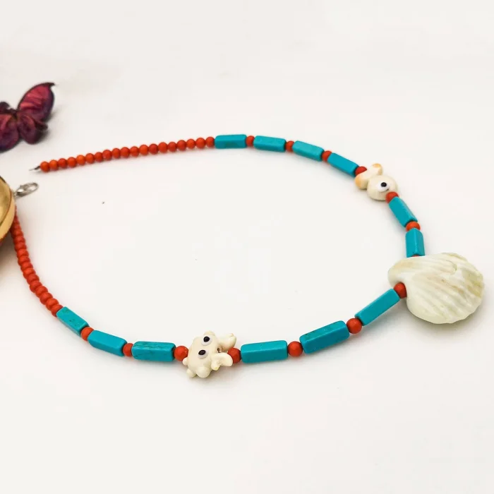 - Made with Murano glasswork, this necklace has a unique and elegant design; - Decorated with turquoise and coral stones, it offers an eye-catching look; - Beads decorated with crab figures are ideal for lovers of nautical-themed accessories; - It stands out as an excellent accessory option for special occasions or daily use;