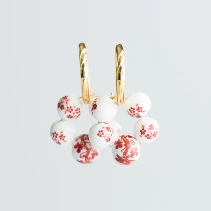 5 ceramic beads including 4 small one big size attached to the gold hoop. Bead color: wine red.