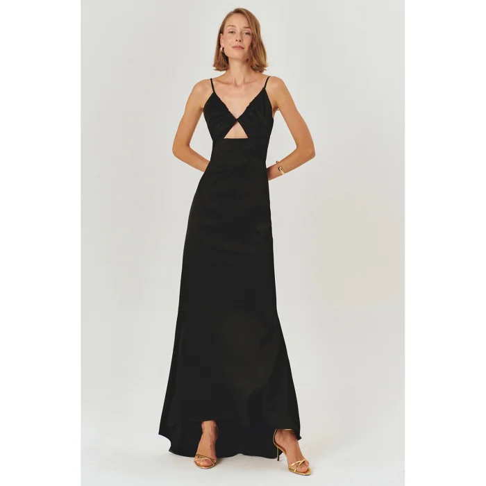 Standing out with its flawless design, the Black Satin Maxi Dress combines elegance and modern lines. With its fluid texture and body-hugging A-cut, it offers both a comfortable and assertive look. While the strappy design adds a feminine touch with its v-neck and stylish window detail under the bust, the low-cut back gives the dress a sophisticated atmosphere.