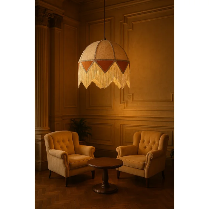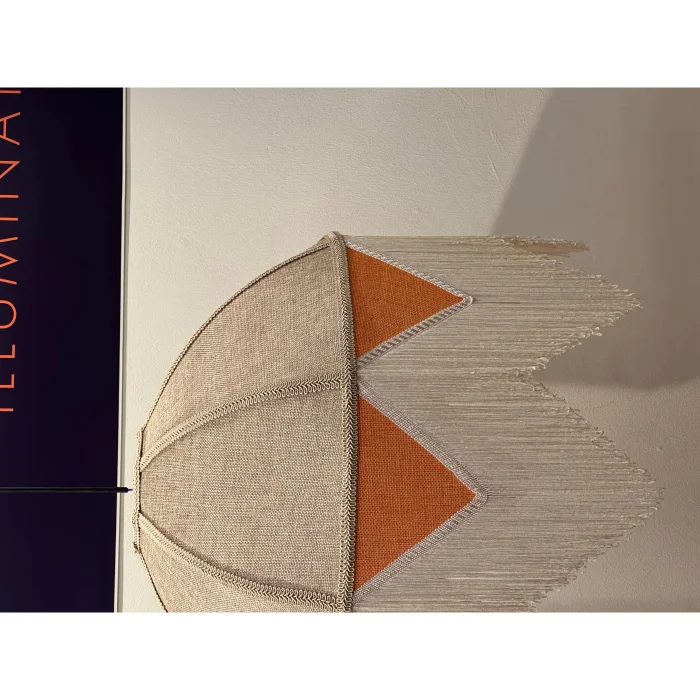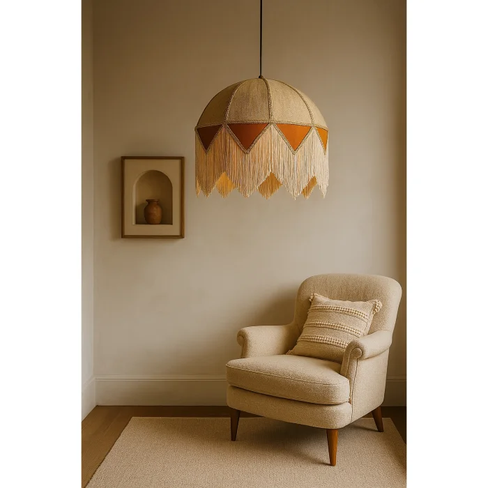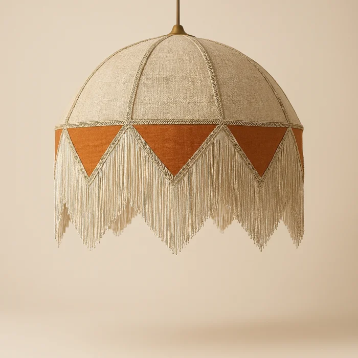 The warm orange detail on the bottom panel gives the space a soft depth in dim light, while the sparkling tassels in cream and silver tones create an elegant dynamism with the movement of light.