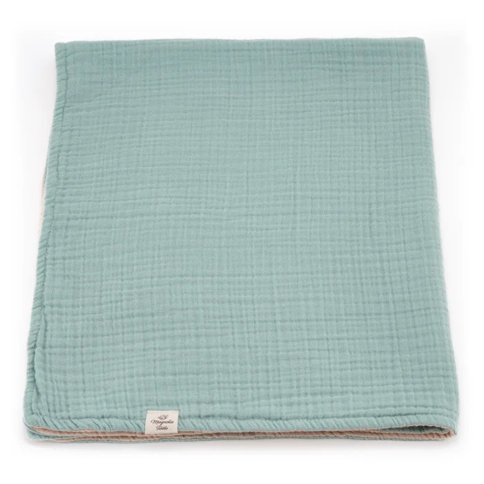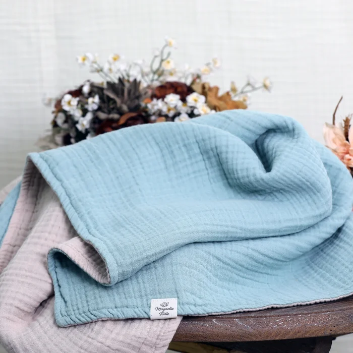 We've brought together 4-layer gauze cotton fabrics (indigo and mink, blue and mink, green and mink)to create this incredibly soft, light and absorbent 8 layer double sided blanket crafted from and breathable muslin fabric.