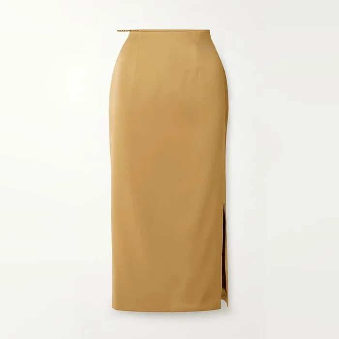 Product: Camel Satin Pencil Skirt With One Side Slit, Cut-out Detail & Chain