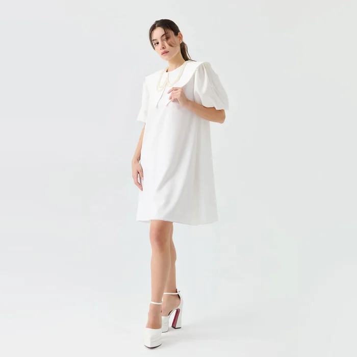 No36 İncili Yaka Detaylı Elbise Beyaz