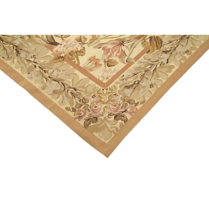 The Aubusson Kilim is 296 cm wide by 433 cm long and about 5 mm thick. It weighs an average of 15 kg. It is made with hand-spun wool and cotton. It takes its colors from root dyes obtained naturally.