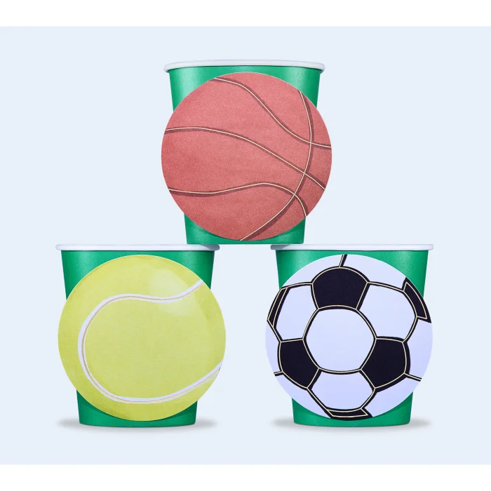 There are 8 green paper cups and 8 paper tennis ball figures in the package.