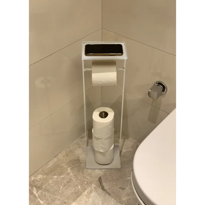 Toilet paper stand with tray. Electrostatic Gold Metal Paint Product dimensions: Length: 54 cm Width: 15 cm Depth: 12 cm There is a capacity of 3 spare rolls at the same time. The top tray is included in the usable area It is recommended not to expose it to water or detergent water.