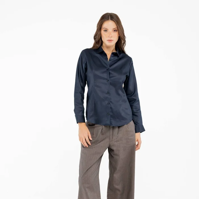 Standing out with its natural shine and smooth texture, this navy blue shirt combines the fluid elegance of Tencel fabric with a modern cut. Thanks to its lightweight structure, it offers comfort all day long, while the slim fit pattern elegantly follows the body lines. With its matte-glossy balanced surface, it provides a simple elegance that extends from day to evening.