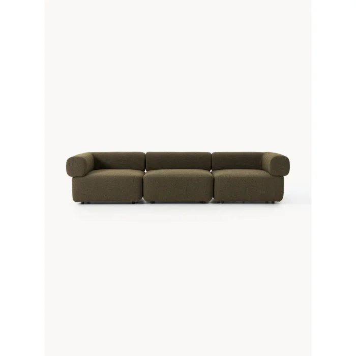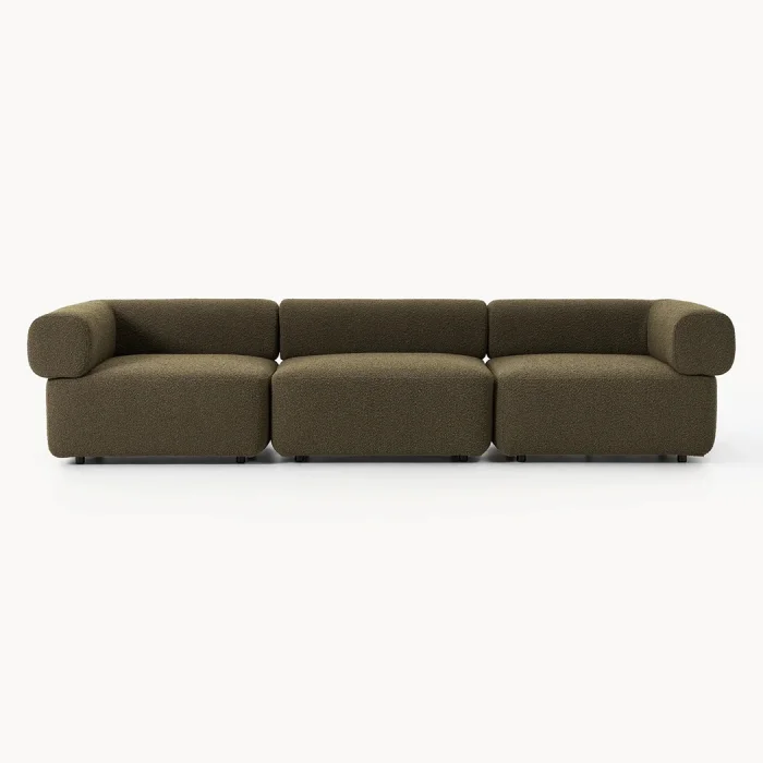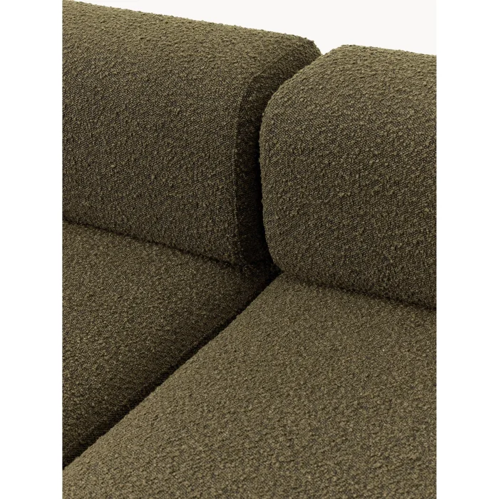 Properties Modular Structure: 3 different modules can be easily combined with the latch system or used separately. Flexible Use: The stool can be positioned to the right, left or independently. Sheath: Boucle fabric (80% polyester, 20% acrylic) Durability: 100,000 frictions in the Martindale test – suitable for heavy use. Filling: High density comfort foam (35 kg/m³) Frame: Beech wood, MDF, chipboard and durable cardboard backed construction Feet: Black plastic feet – lightweight, sturdy and ground-resistant. Colors: Off white, olive green, terracotta, turquoise green, gray blue, pink and dozens of color combinations Decor: Silver Feet: Black DELIVERY AND USE The product is delivered fully assembled, only the feet need to be attached. The fabric cover is not removable. All modules can be rearranged in different combinations. Made in Turkey. CARE ABOUT We care about protecting nature and sustainable production. As INNATURE, we produce with recyclable and environmentally friendly materials; We combine aesthetics with naturalness. Each piece is the product of long-lasting use and an environmentally friendly design approach.