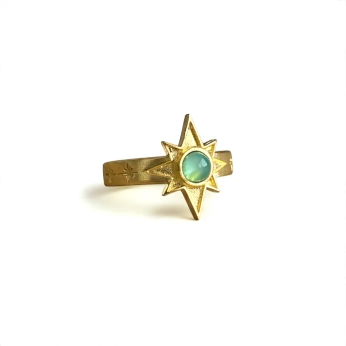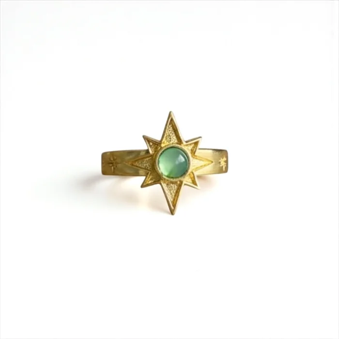 It is made of natural stone and brass. Since it is adjustable, it is compatible with all fingers. Due to the 100% natural materials, there may be slight variations in color and pattern.