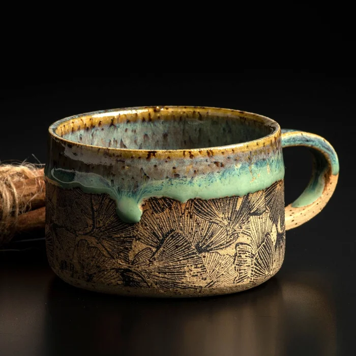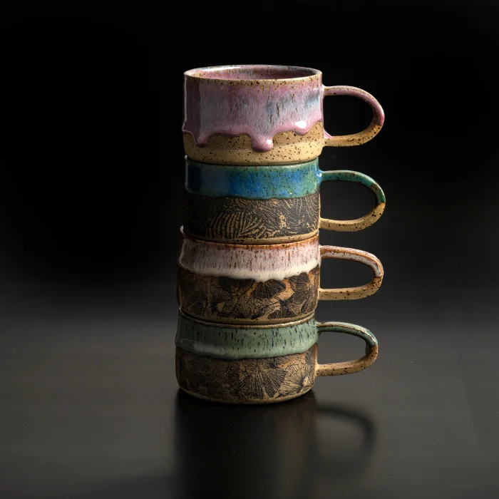 Stoneware is drawn from clay on a potter's lathe. The patterns on it are decal prints and brought from America.