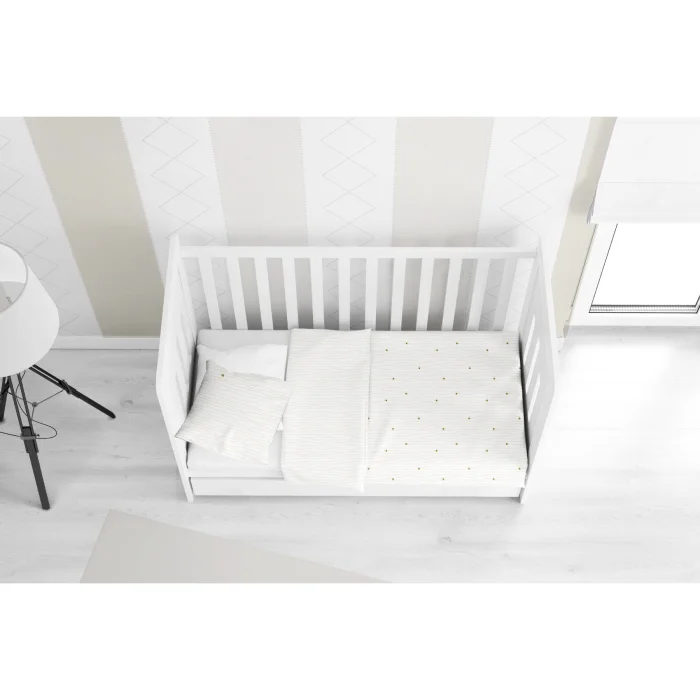 Sheet: 1 piece 120x180cm Duvet cover: 1 piece 100x150 cm Pillow Case: 2 pcs 35x45cm Casadora Baby bedding set has a shiny, draping and silky softness thanks to its satin fabric