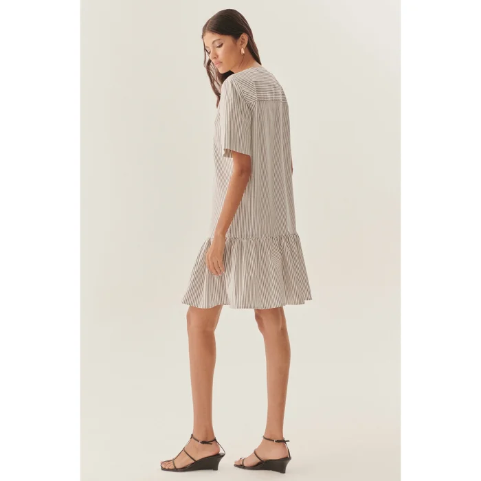 Pleated, Relaxed Cut, Striped Cotton Dress With Buckle Detail On The Collar