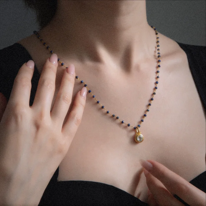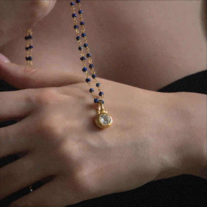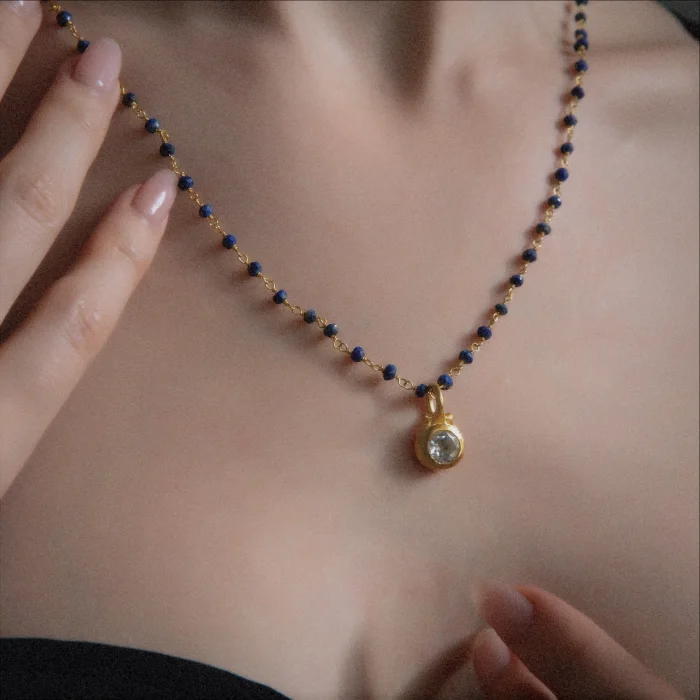 Completely handmade and set white topaz with lapis lazuli chain.