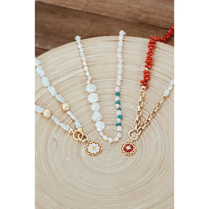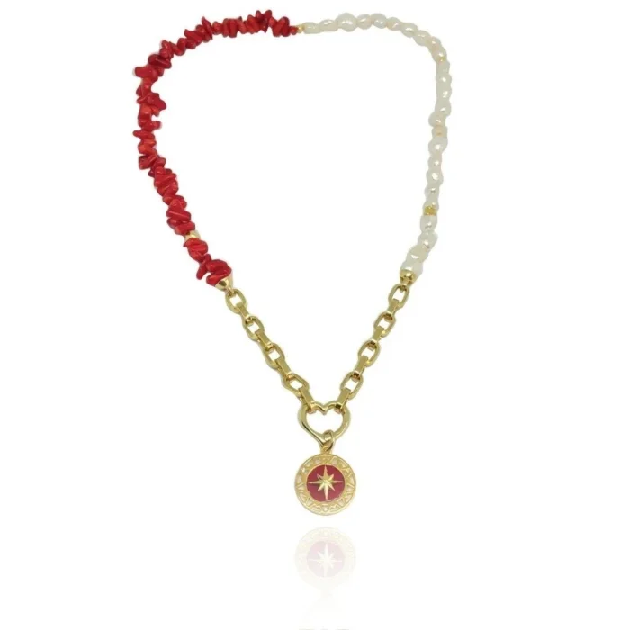 925 sterling silver, , 22 carat gold-plated Red Coral & Chain and Smallsize Almond-shaped Pearl Necklace