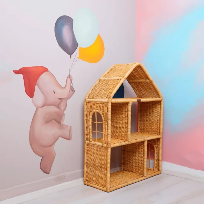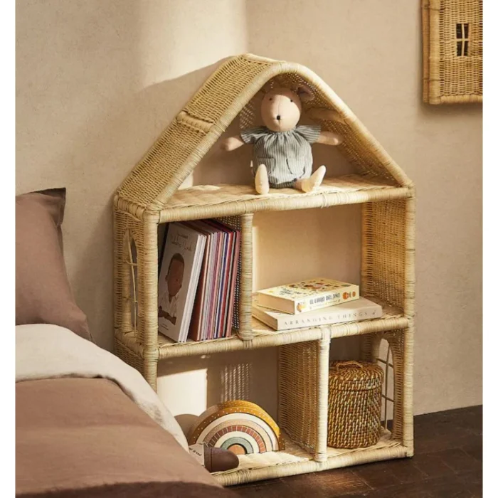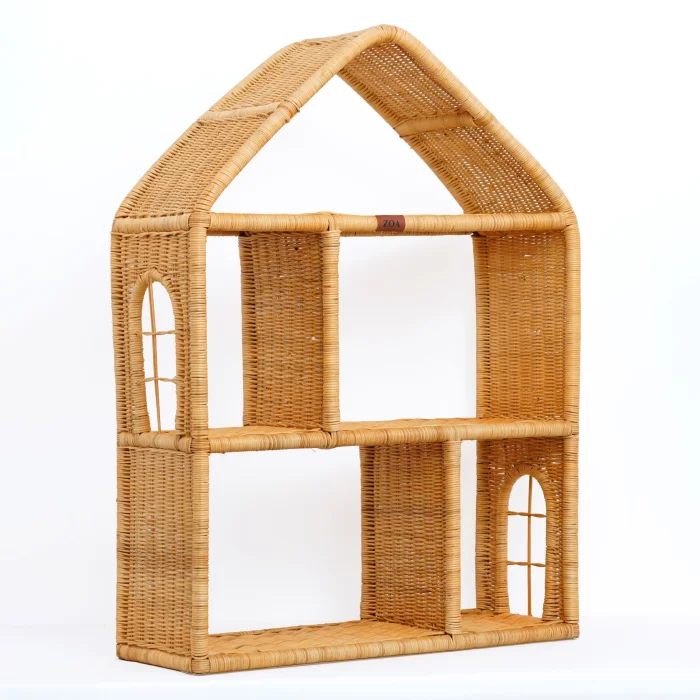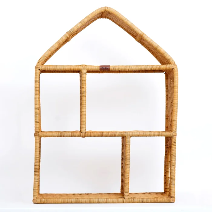 Rattan bookcase in the shape of a house - it has 5 compartments of different sizes and a decorative window on each 2 sides. Since the product is handmade, there may be slight differences between it and the visual.