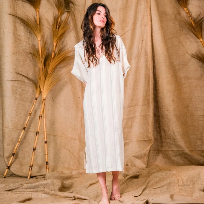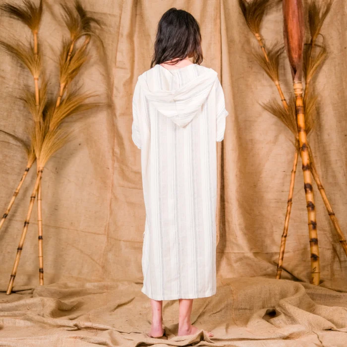 Ares, the longline kaftan with side slits and a hood. The cotton heavy, handwoven light-weight fabric is highly absorbent and dries quickly.