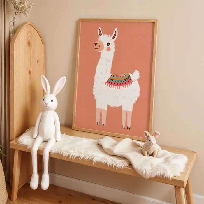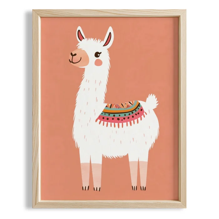 Product: Cute Lama - Pastel Somon Background Children's Room Wooden Framed Wall Art