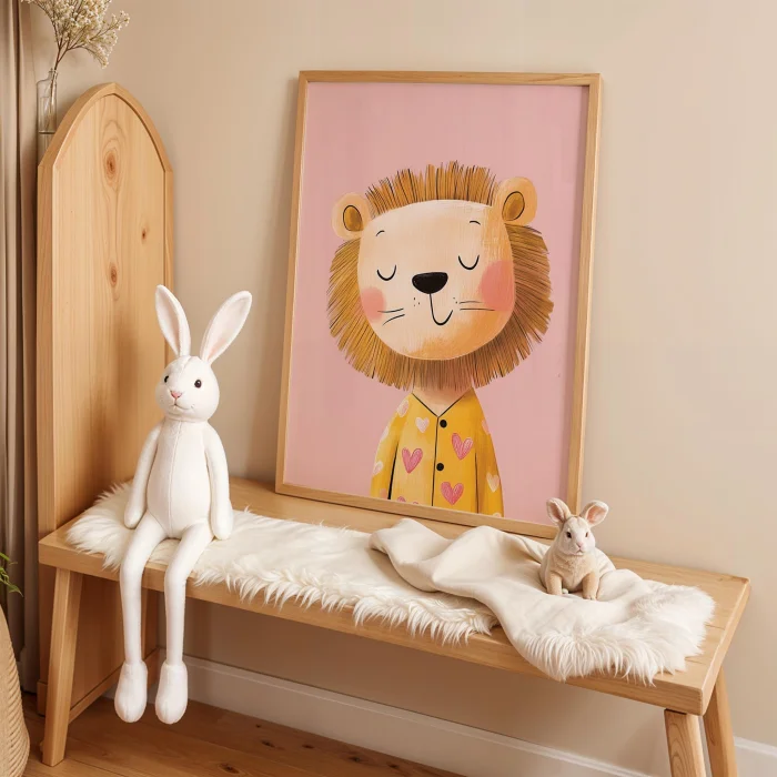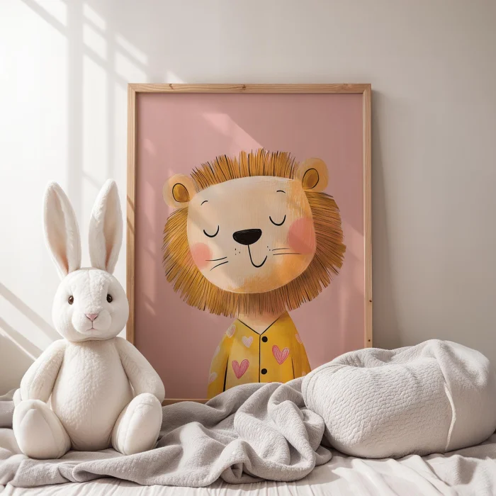Product: In Pajamas Sleeper Tiger - Pink Background Children's Room Wooden Framed Wall Art