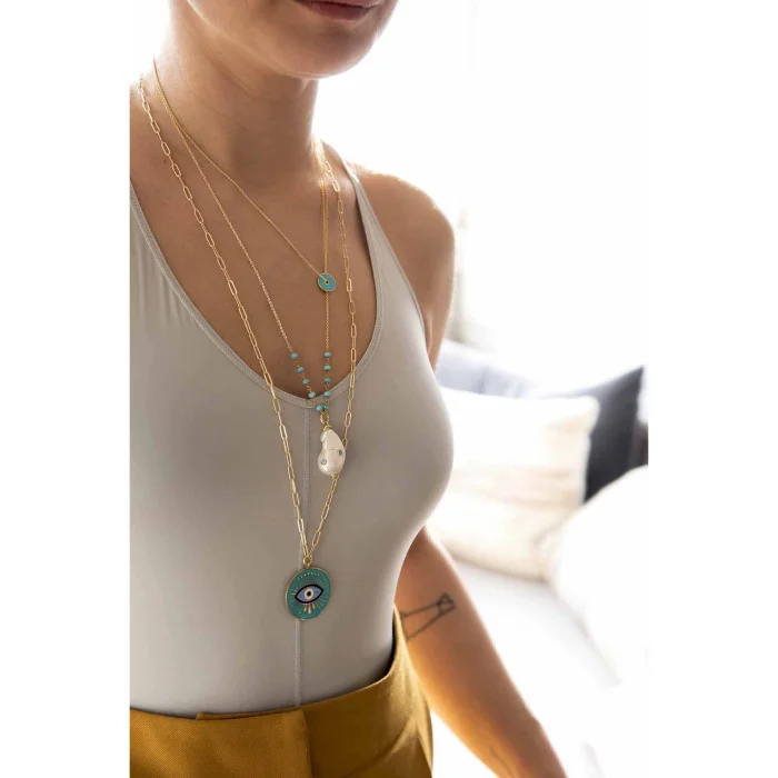 The chain length of the necklace, which is designed using a gold-plated chain on brass, turquoise stones knitted with hand wire and a baroque pearl set with turquoise setting, is 60 cm and the average length of the pearl is around 1.5-3 cm.