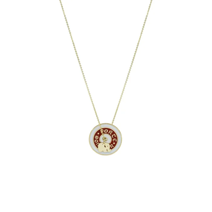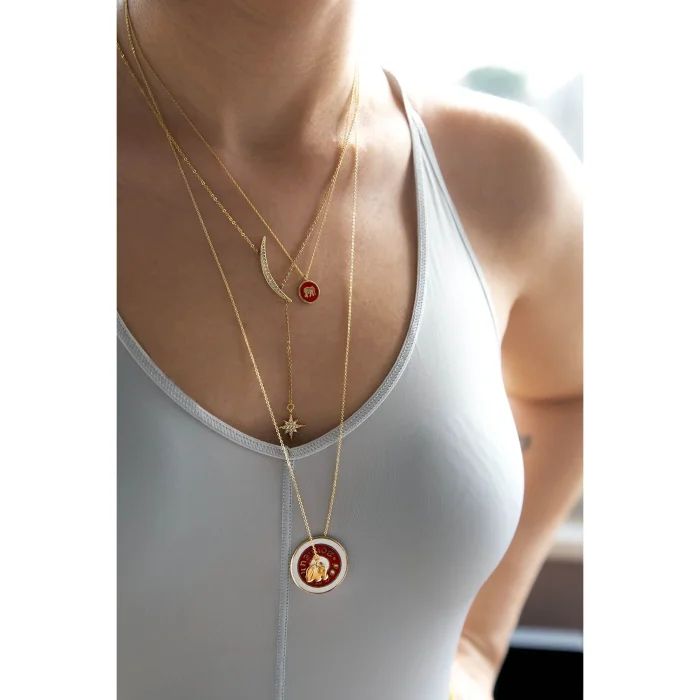 Central hole lucky coin pendant necklace with red - white enamel and minimal elephant charm