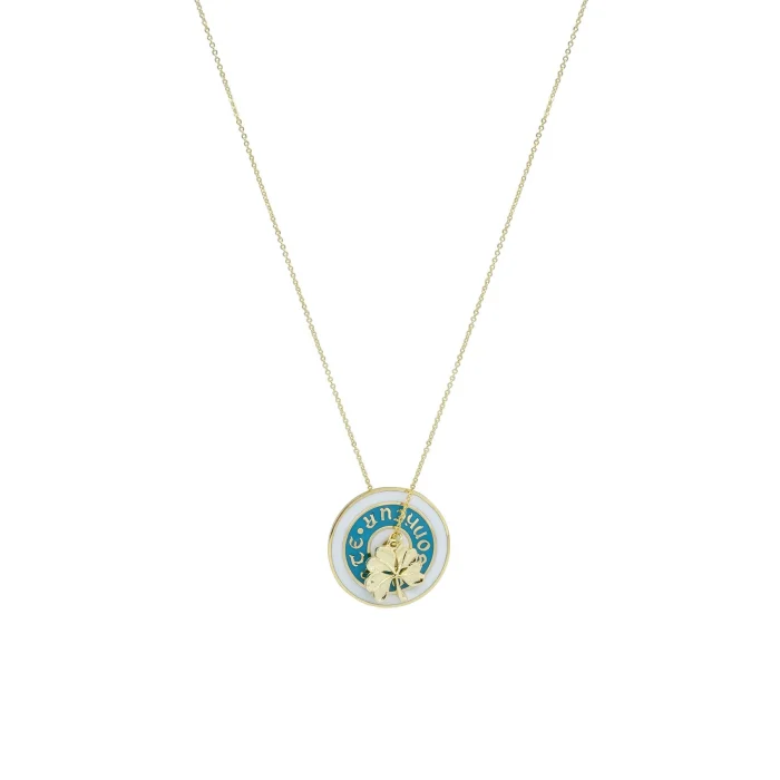 Central hole lucky coin pendant necklace with turquoise - white enamel and minimal shamrock charm